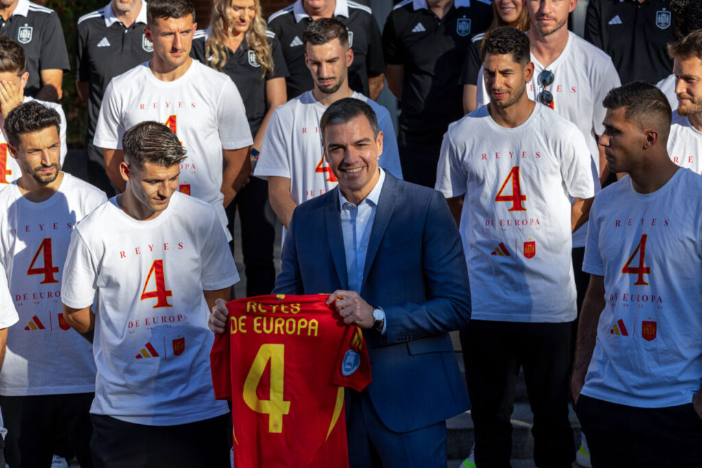 «Enhorabuena a todos y cada uno de vosotros. Además de la enhorabuena quería daros las gracias por haber dado la mejor versión de España, por haber mostrado capacidad de esfuerzo, de remontada, de espíritu de equipo, de preparación, de estrategia y de juego limpio y juego bonito», indicó en la recepción que hizo a los campeones en el Palacio de la Moncloa, en la que fue obsequiado con una camiseta con el lema ‘Reyes de Europa’ en la parte trasera y el dorsal número 4 en honor a las ediciones de este torneo ganadas por España.