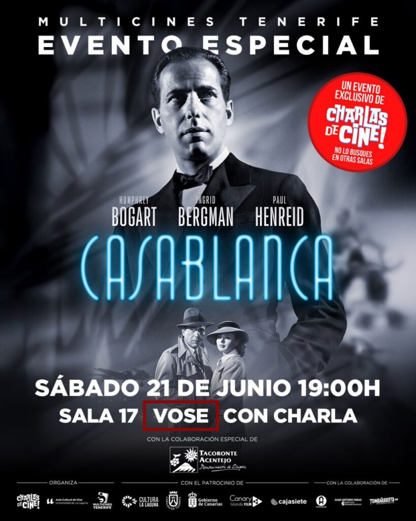 Protagonizada por Humphrey Bogart, Ingrid Bergman, Paul Heried y Claude Rains, se trata de una película que ha dejado secuencias y algunas frases inolvidables de la Historia del Cine. Sin embargo, fue también una película que acarreó una producción muy conflictiva. ‘Charlas de Cine’ la recupera en todo su esplendor este sábado 21 a las 19:00 horas en Multicines Tenerife.