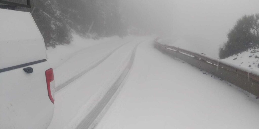 Las precipitaciones durante la noche llevaron a que se registrasen nevadas en las cumbres de ambas islas. Los trabajadores que tenían que circular por la zona se encontraban la calzada completamente blanca.