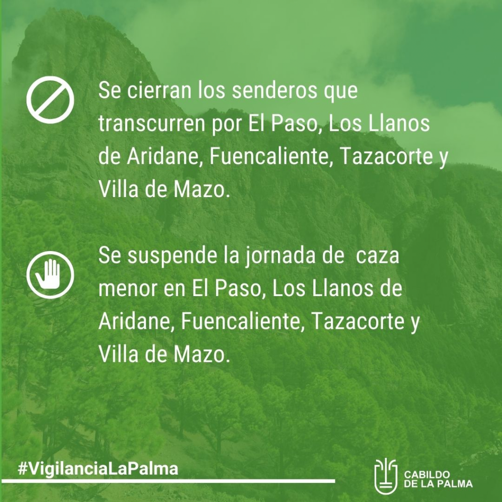 Asimismo, la Corporación insular ha decidido suspender la jornada de caza menor en El Paso, Los Llanos de Aridane, Fuencaliente, Tazacorte y Villa de Mazo.