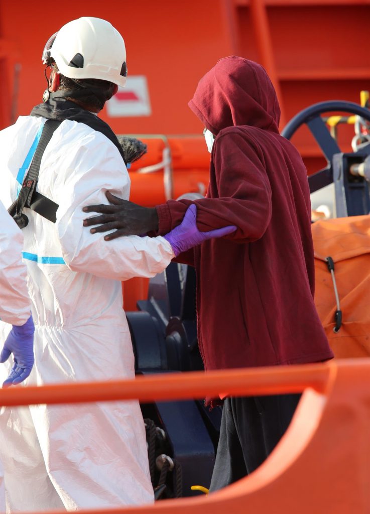 Hasta la llegada de la embarcación de Salvamento Marítimo, los migrantes fueron auxiliados con agua y comida por el pesquero y un buque mercante que también se desplazó al lugar.