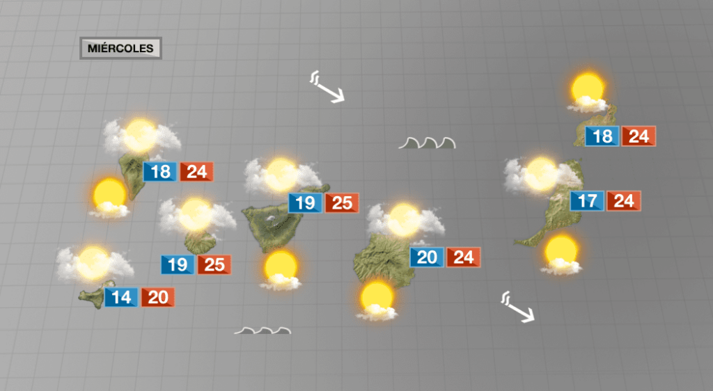 Este miércoles las temperaturas bajarán de forma progresiva en Canarias, y en medianías de forma notable, en algunas zonas más de 4 ºC. El viento flojo del oeste y suroeste de la madrugada arreciará a moderado y rolará al noroeste. Se prevé viento del oeste moderado – fuerte en las cumbres de El Hierro y de La Gomera, y será fuerte y racheado en las de La Palma y de Tenerife a partir de unos 1.800 metros de altitud.