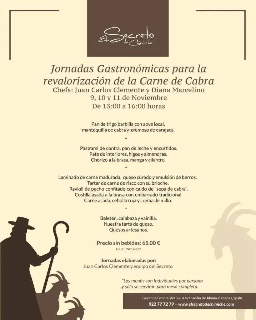 Roberto Castro, director de sala de El Secreto de Chimiche (un sol Repsol), avanza algunos de los acicates de las jornadas de revalorización de la carne de cabra, con propuestas de Diana Marcelino y Juan Carlos Clemente; jornadas, asimismo, en la Gastrotienda de San Cristóbal de La Laguna: María José Padrón habla de un ‘clásico’ como son los almuerzos y cenas en torno a especialidades mexicanas por el Día de Difuntos y que cumple 14 años en liza.