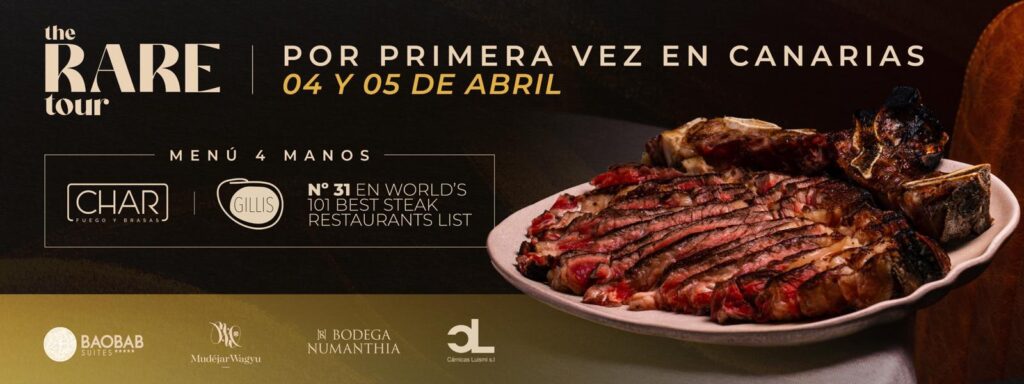 Babacar Fall, jefe de cocina de Char (Adeje, un Sol Repsol), explica lo que será este fin de semana, 4 y 5 de abril, un evento gastronómico sin precedentes denominado “The Rare Tour”, una serie de eventos exclusivos organizados por los creadores de la prestigiosa lista 101 World’s Best Steak Restaurants. Se trata de la referencia mundial en el universo de la carne y para esta ocasión el chef Baba compartirá parrilla con Gillis Steak House, que ocupa la posición 31 en el listado.