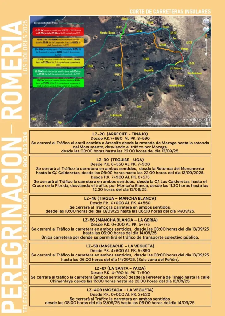 En la LZ-30 (Teguise–Uga) no se podrá circular en ambos sentidos desde la rotonda del Monumento hasta la calle Calderetas, de 08:00 a 22:00 horas del mismo día.