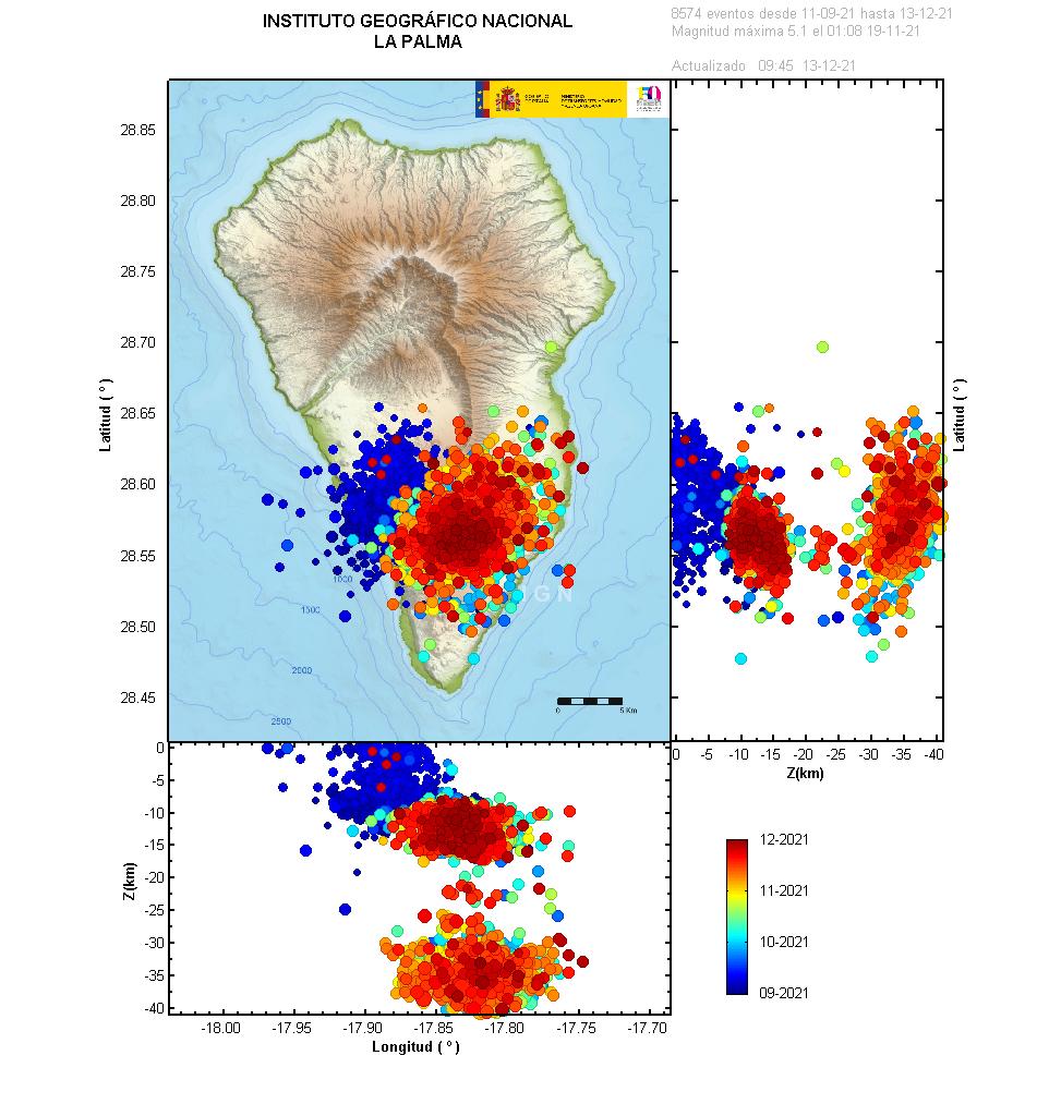 La sismicidad continúa en niveles bajos en la zona central de Cumbre Vieja, en las mismas zonas de días anteriores. La mayor parte de los sismos están localizados a profundidades intermedias, entre 10 y 15 km, y únicamente uno de ellos a profundidades superiores a 20 km.