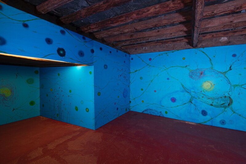 Así, reúne, en una única superficie, la memoria de las ciudades superpuestas, los paisajes neuronales de su trayectoria vital, y el legado de hongos y bacterias que nos sostienen sobre la tierra, convirtiendo el interior de esta vivienda en una ‘duramadre’ sobre la que Guerra vuelca su reflexión acerca de la pintura.
