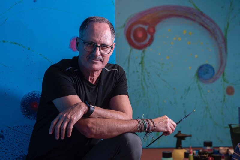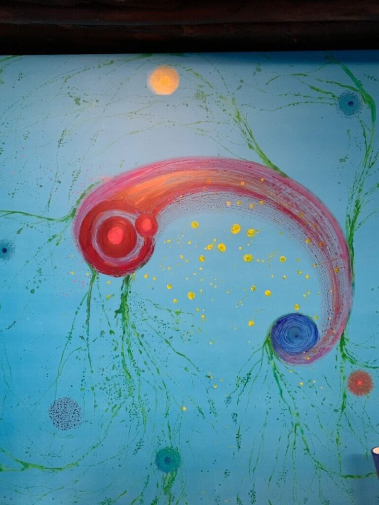 “Pretende ser una propuesta inmersiva, donde las redes neuronales y las conexiones entre raíces y microbiología del suelo nos hacen recrear ese mundo invisible a nuestros ojos”, desarrolla el artista. El proyecto está pensado para estimular los sentidos. Además de las formas y colores plasmados, la experiencia cuenta con la ayuda de difusores de aromas y con la importantísima colaboración del sonido a modo de banda sonora, a cargo del compositor Juanda Mendoza, que ha sabido poner sonido a esos sutiles pero constantes procesos vitales. “Una preciosa composición que logra hacernos sentir el flujo de la vida”, añade Guerra.