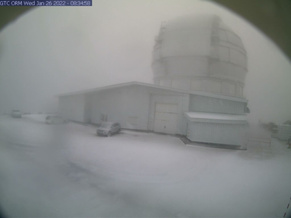 Esta mañana ha amanecido con cumbres nevadas en Las Cañadas del Teide y en el Observatorio del Roque de Los Muchachos con una capa de nieve. Las previsiones ya apuntaban a que podrían registrarse nevadas