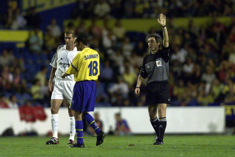 Vinny Samways y Zinedine Zidane en la imagen junto al colegiado Losantos Omar en el Estadio Insular.