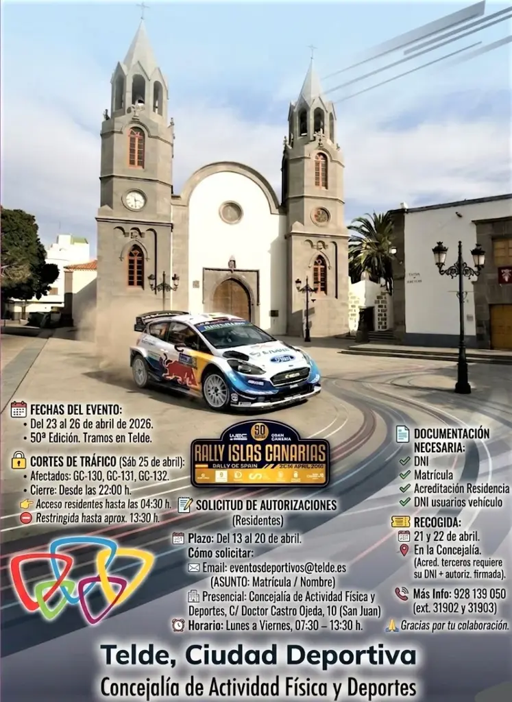 Con motivo de la celebración de la 50ª edición del Rally Islas Canarias 2026, que tendrá lugar entre los días 23 y 26 de abril, en distintos municipios de Gran Canaria, y cuya parte del recorrido utilizará vías dentro de la ciudad de Telde. La Concejalía de Actividad Física y Deportes del Ayuntamiento de Telde, ha establecido un dispositivo especial para regular la movilidad en las vías del municipio afectadas por el recorrido de la prueba.