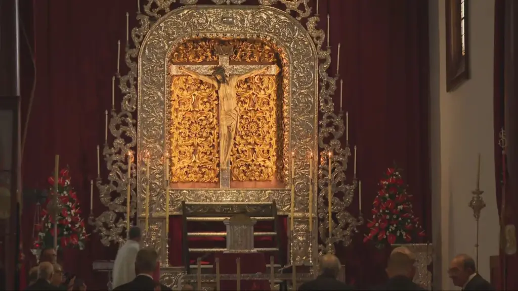 Después de una eucaristía, los miembros de la Esclavitud del Santísimo Cristo retiran la imagen del altar mayor. Esta ceremonia marca el inicio de los actos religiosos de las fiestas del patrón de la ciudad de los Adelantados.
