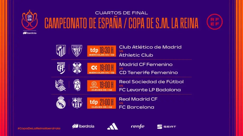 El 5 de febrero se disputarán los otros dos partidos de esta fase del torneo: Real Sociedad vs. Levante Badalona y Real Madrid vs. FC Barcelona, una rivalidad histórica en la categoría masculina.