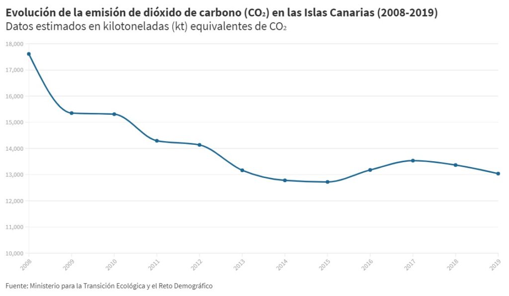 Según el informe del Ministerio para la Transición Ecológica y el Reto Demográfico, Canarias se encuentra en la undécima posición entre todas las Autonomías en emisiones acumuladas de dióxido de carbono en estos últimos treinta años. El pico más alto de emisiones se registró en 2008, con un total de 17.614 kilotones (kt) de CO2 emitido. En 2019 la cantidad total ya había disminuido notablemente, un 26%.