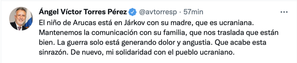 «La guerra solo está generando dolor y angustia. Que acabe esta sinrazón. De nuevo, mi solidaridad con el pueblo ucraniano», remata Ángel Víctor Torres en su cuenta personal de Twitter.