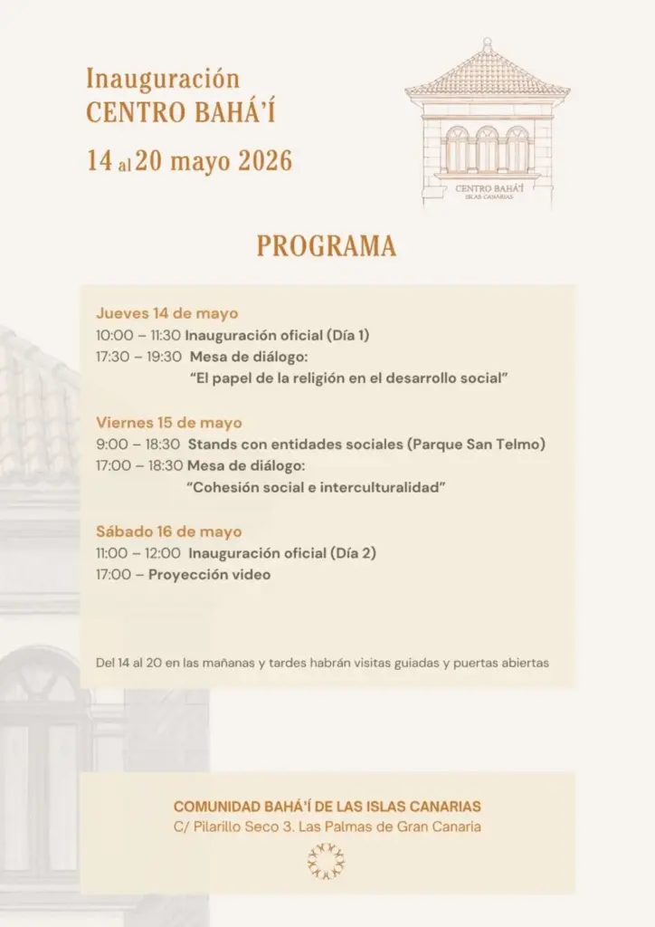 El eje central del programa será la inauguración del nuevo Centro Administrativo e Institucional de la Comunidad Bahá’í de las Islas Canarias, ubicado en la calle Pilarillo Seco nº 3, en Las Palmas de Gran Canaria. Un lugar concebido no solo para la gestión interna, sino como punto de referencia abierto a la ciudadanía, orientado a la educación, la convivencia y el desarrollo social.