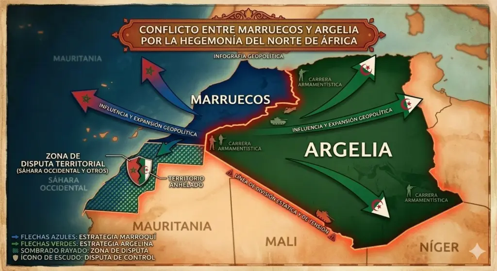 Marruecos y Argelia compiten por el liderazgo en la zona mediante estrategias militares y alianzas internacionales opuestas. El experto en geoestrategia Miguel Ángel Melián explicará cómo el reino alauita se apoya en la tecnología de Estados Unidos e Israel, mientras que Argelia mantiene su estructura basada en el soporte de Rusia y China.