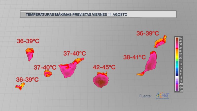 La primera ola de calor del verano dejará el viernes y sábado temperaturas de 38º en todas las islas, además se alcanzará y superará de forma local máximas de 40º, incluso algún registro de 42º-43º en medianías del sur de Gran Canaria.