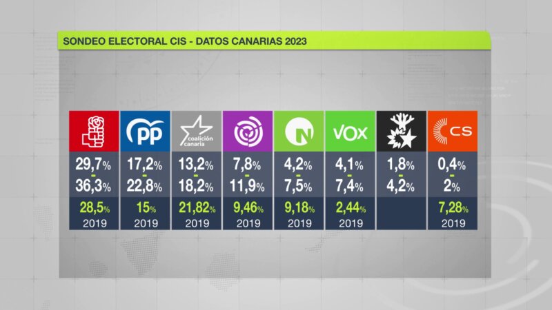 El PSOE ganaría las elecciones del 28M en Canarias con el 33% de los votos, mientras que el PP arrebataría el segundo puesto a CC al llegar al 20%, según recoge la encuesta publicada este jueves por el Centro de Investigaciones Sociológicas (CIS).