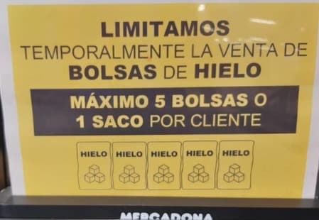 La cadena de supermercados Mercadona ha comenzado a limitar la venta de hielo a 5 bolsas o un saco por persona. Como ya se hiciera al inicio de la pandemia con el papel higiénico o después, con el aceite de girasol. Lo mismo hacen otros supermercados como Consum, con dos bolsas por persona.