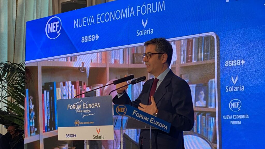 En esa línea se ha expresado el ministro de la Presidencia Félix Bolaños, en un desayuno informativo de Nueva Economía Fórum.