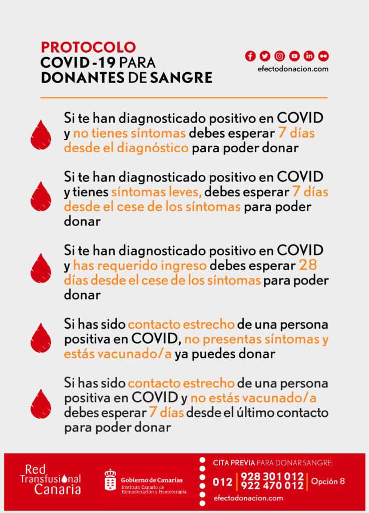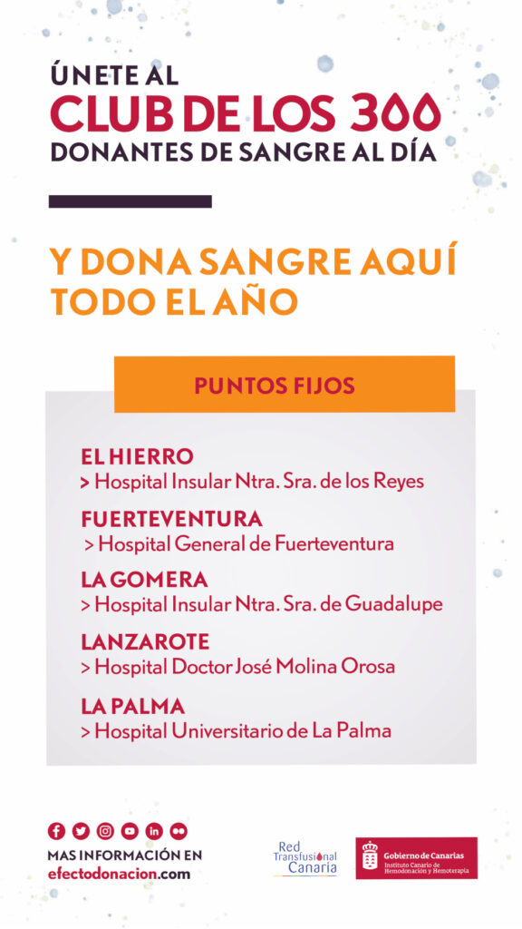 En Lanzarote permanece operativo el punto fijo de donación de sangre de la Red Transfusional Canaria en el Hospital Universitario Doctor José Molina Orosa. El horario será de lunes a viernes de 9:00 a 13:00 horas. Para donar es necesario solicitar cita previa en el número 928 59 55 72 opción 3.