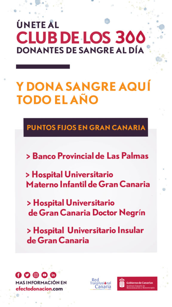 También se puede acudir al Hospital Universitario Materno-Infantil de Canarias de lunes a viernes de 10:00 a 13:30. Así como al H.U. de Gran Canaria Dr. Negrín de lunes a viernes de 8:30 a 13:30 y de 14:00 a 19:30. Otro punto más es el H.U.Insular de Gran Canaria, donde se puede donar de lunes a viernes de 10:00 a 14:00 horas, salvo festivos (cuenta con vado para donantes en ambos casos).