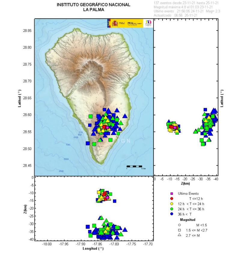 De los 9 terremotos de las primeras horas de este jueves 5 han sido localizados en Mazo, 2 en Fuencaliente y 2 en El Paso, y las profundidades han oscilado entre los 10 y los 38 kilómetros.