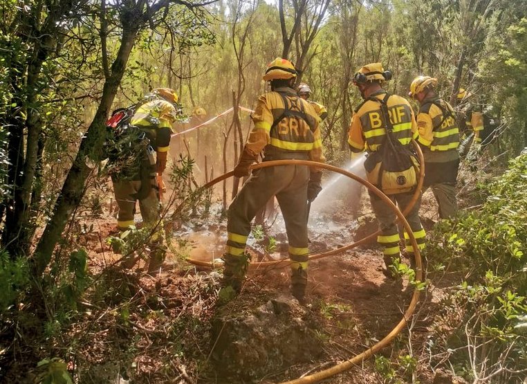 Efectivos de la BRIF de La Palma desplazados a Tenerife continúan en labores de remate y vigilancia de perímetro apagando puntos calientes.