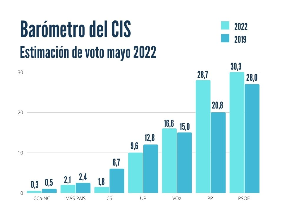 La encuesta del Centro de Investigaciones Sociológicas, elaborada entre el 3 y el 12 de mayo, en plena crisis por el espionaje, apunta a una importante subida de Vox, que en solo un mes sube 2,2 puntos hasta el 16,6 por ciento de los sufragios, justo lo contrario que Unidas Podemos, que se deja otro punto desde abril y se queda en el 9,6 por ciento.