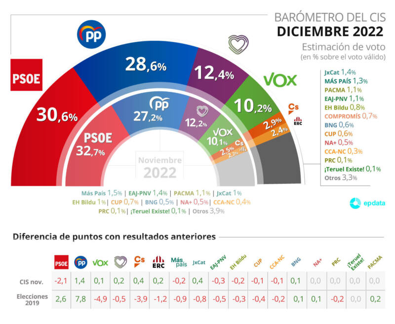 El último barómetro del Centro de Investigaciones Sociológicas (CIS) difundido este miércoles mostraba una distancia de dos puntos entre socialistas y populares, pero el muestreo de este jueves, 22 de diciembre, a partir 5.545 entrevistas, indica que el PSOE obtendría el 29,4% de los sufragios frente al 28,8% del PP.