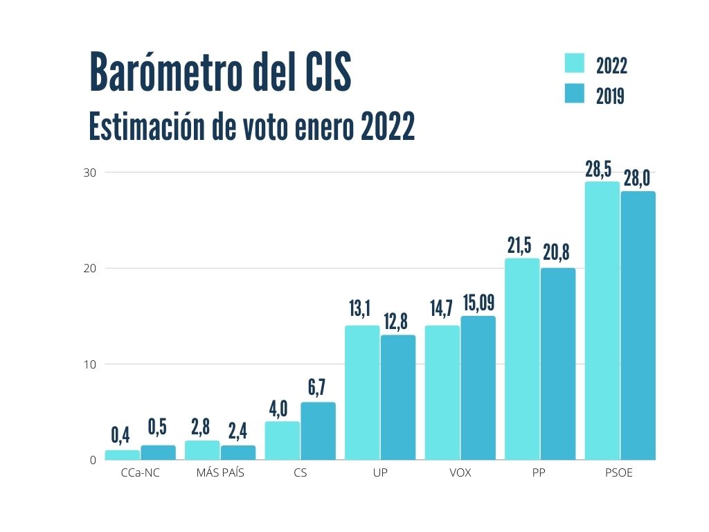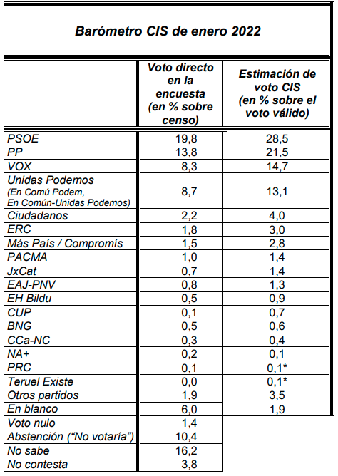 Del otro lado del espectro político, PP vería aumentada su estimación de voto del 20,8 por ciento de diciembre al 21,5 de enero, recortando en dos décimas su distancia con los socialistas.
