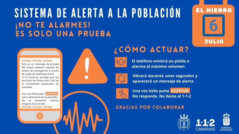 El sistema ES-Alert se ha probado en la isla de El Hierro este jueves 6 de julio, a las 11:00 horas, convirtiéndose en el primer ejercicio a nivel insular en Canarias de esta nueva herramienta del Sistema Nacional de Protección Civil. El ensayo del sistema de aviso a la población a través de redes de telefonía móvil, conocido como el ‘1-1-2 inverso’ está organizado por el Gobierno de Canarias, a través de la Dirección General de Seguridad y Emergencias y el CECOES 1-1-2, en colaboración con el Cabildo de El Hierro.