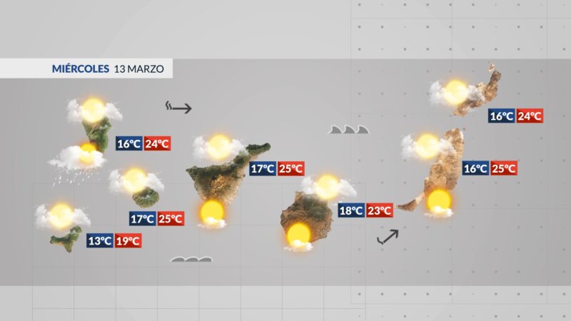 Este miércoles las temperaturas irán en ascenso que en zonas de medianías de la vertiente nordeste-este de Tenerife, Gran Canaria, Fuerteventura y Lanzarote, podría ser moderado. El viento soplará flojo en general del sureste que por la tarde irá girando a noroeste.