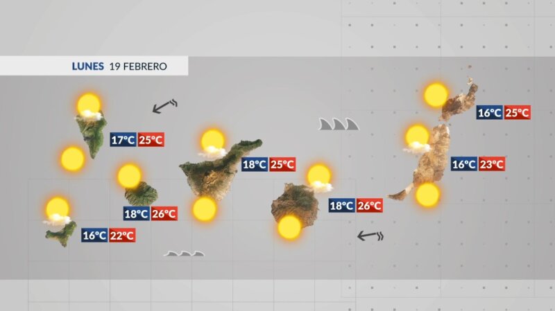 TENERIFE: Excepto algunas nubes cielos despejados. Temperaturas sin cambios o en ligero ascenso en costas, y en ligero descenso en zonas de interior. Viento de componente este moderado con intervalos de fuerte en medianías y cumbres, y probables rachas muy fuertes en vertientes orientadas al norte. El polvo en suspensión irá a menos a lo largo del día en esta isla.