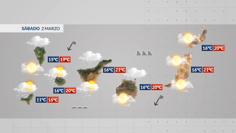 Las precipitaciones podrían ser en forma de aguanieve en cumbres de La Palma o en el entorno de Izaña, en Tenerife. Temperaturas frescas en medianías y cumbres, valores 18 – 23ºC en costas. Soplará el alisio moderado, todavía con intervalos de fuerte en vertientes Sureste, Noroeste y cumbres de las islas más montañosas por la mañana.