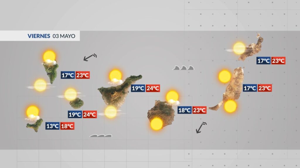 Este viernes seguiremos con viento alisio moderado. Soplará con menos intensidad en La Gomera y Tenerife. Habrá intervalos fuertes a partir de mediodía en los extremos noroeste y sureste de las islas, y rachas en estos puntos, que rondarán los 60 km/h.