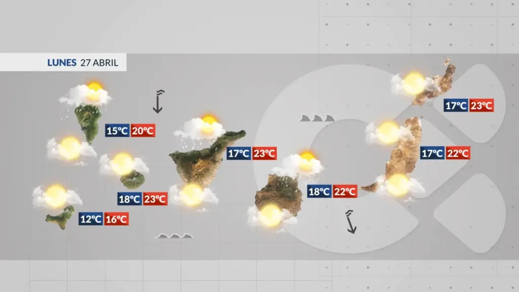Este lunes tendremos cielos con intervalos nubosos o nubosos en el norte de las islas más montañosas donde son probables lluvias débiles, ocasionales y dispersas. Serán más probables durante la madrugada y por la noche. Se generará nubosidad de evolución en las islas centrales donde cabe la posibilidad de que pueda caer alguna gota en el interior y sur por la tarde. En las islas más orientales, Fuerteventura, Lanzarote y La Graciosa no se descarta precipitaciones débiles y ocasionales sobre todo en el norte y vertientes oeste.