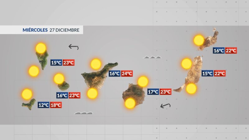 Las únicas nubes, de tipo bajo al amanecer en parte del Este-Nordeste de las islas, y algunas pinceladas de nubes altas que entrarán por el Oeste del archipiélago