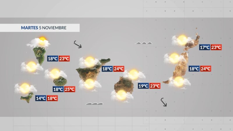 La Graciosa: Intervalos nubosos de tipo medio y alto durante todo el día, sin mayores consecuencias. Las temperaturas irán en ligero ascenso , oscilarán entre los 17 y 23 grados.