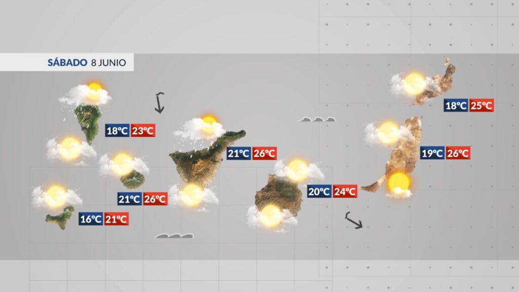 Tenerife: Cielos nubosos, tendiendo a poco nubosos en la vertiente oeste por la tarde. En la vertiente norte podrá llover de forma débil por la mañana y en horas centrales. Por la tarde, en interiores del este, lluvia débil pudiendo ser localmente moderadas o en forma de chubascos. Temperaturas máximas 26-28 ºC en la vertiente sur y área metropolitana.