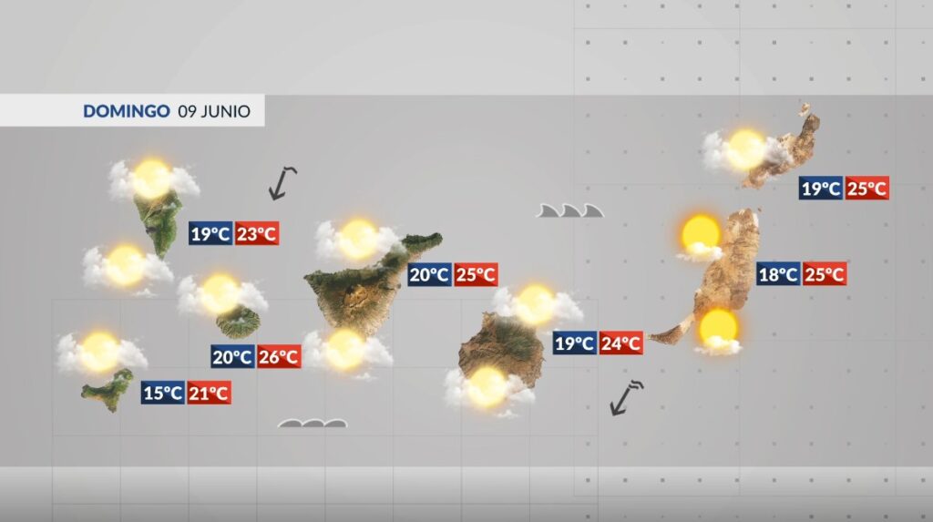Este domingo habrá cielos nubosos en las islas de mayor relieve. Por la tarde tenderán a intervalos, y se podrá disfrutar de más ratos de sol. En estas islas, podrá llover de forma débil y ocasional, de madrugada en el norte, y por la tarde en interiores del sur-sureste, así como en el este de La Palma. En las más orientales, intervalos nubosos por la mañana. Por la tarde predominio del sol.
