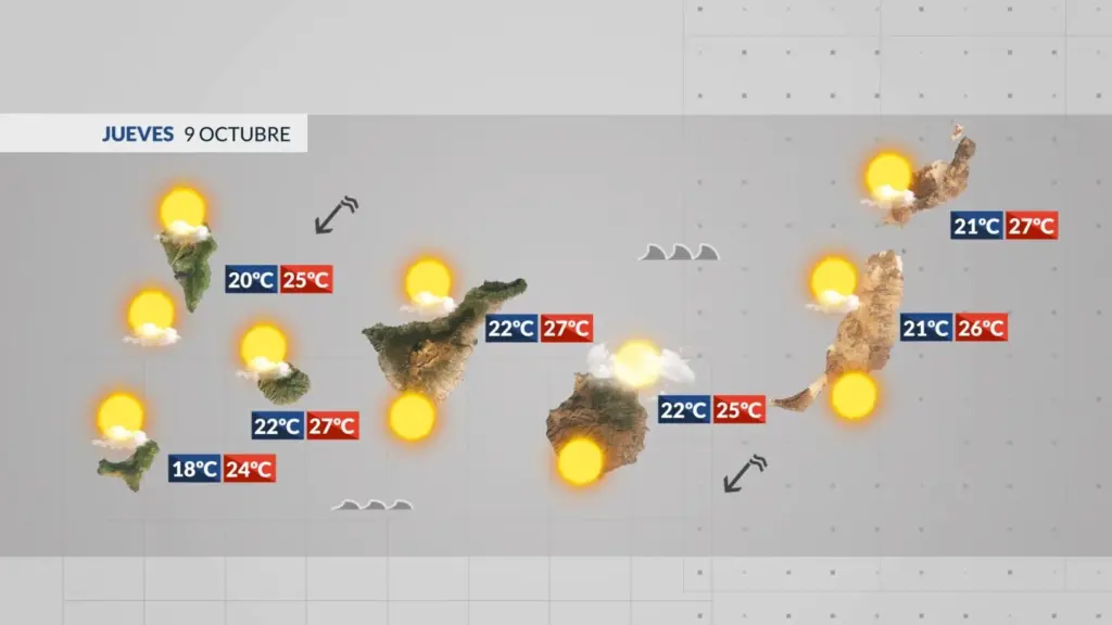 El viento soplará del nordeste con intervalos de fuerte en los litorales sureste y noroeste de las islas montañosas, donde no se descartan rachas ocasionales muy fuertes de madrugada, y en cumbres pronostica que será flojo de dirección variable, tendiendo a componente norte al final del día.