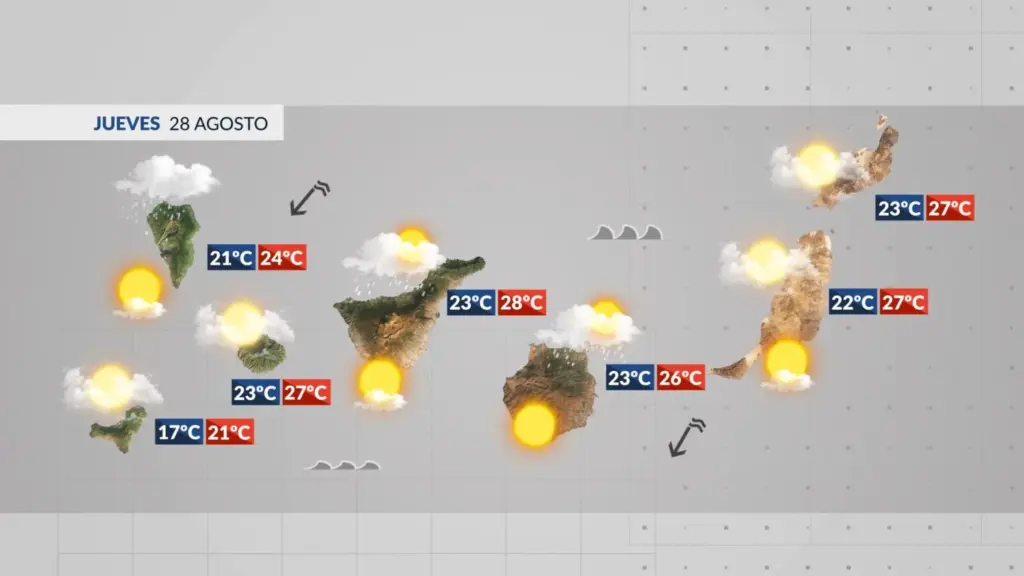 Este jueves predominarán los cielos nubosos y serán probables las lluvias débiles por el norte de las islas más montañosas, pudiendo ser persistentes en las medianías del este y nordeste de La Palma. Irán a menos a lo largo de la tarde. En el resto de zonas predominarán los cielos poco nubosos.