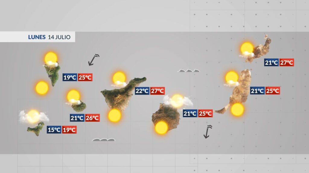 La Palma: Las temperaturas más elevadas superarán los 26-28 ºC. Intervalos de nubes bajas en el norte y este, principalmente al final de la tarde. Nubes de evolución en el noroeste e interiores del este. Rachas fuertes en el noroeste y sureste.
