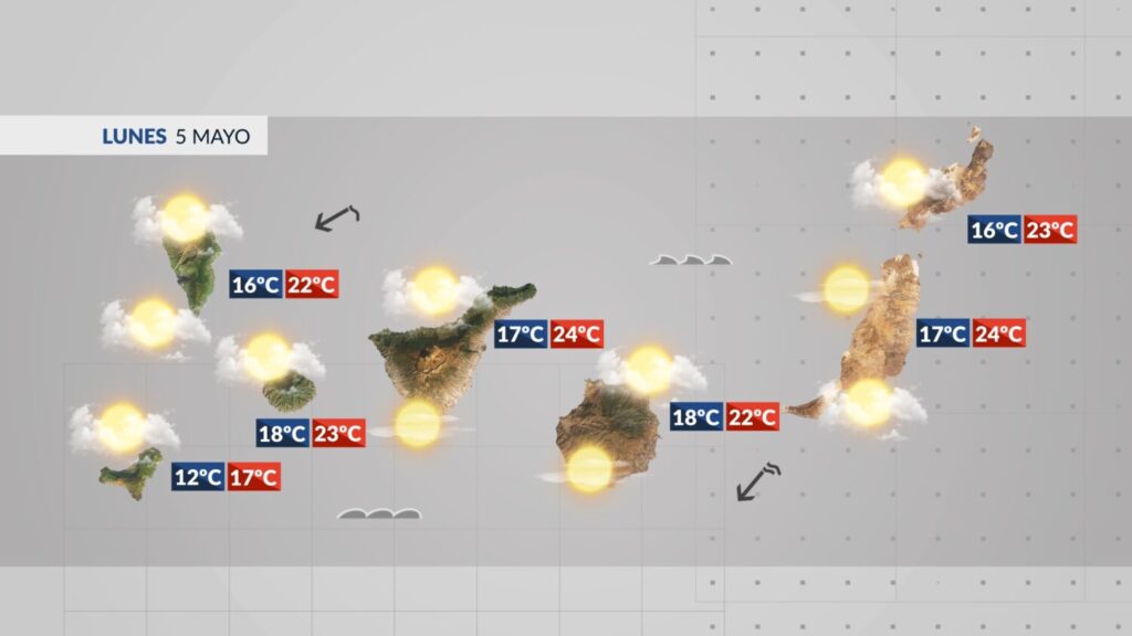 Este lunes veremos cielos nubosos en todas las islas. Habrá intervalos de nubes bajas en el norte, sobre todo a primeras y últimas horas, nubes de evolución diurna en interiores y zonas del este, y, además, intervalos de nubes medias y altas. No se esperan grandes consecuencias, podría caer alguna gota aislada en interiores.
