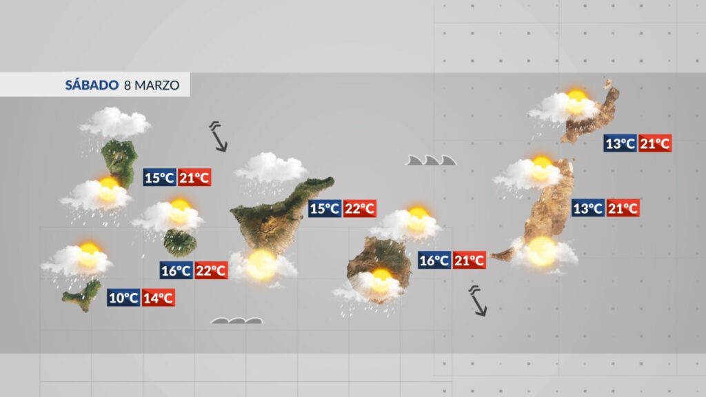 Gran Canaria: Cielos nubosos por el Norte y la capital con algo de lluvia débil hasta media tarde. En el resto, nubosidad de evolución con algún chubasco ocasional en zonas de interior por la tarde. Temperaturas algo más bajas, y viento del Noroeste mod.