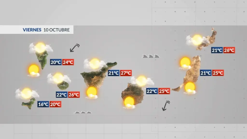 Tenerife: Muchas nubes por el Norte y Nordeste, especialmente a primeras y últimas horas. En el resto lucirá el sol, con intervalos de evolución por el Suroeste. Temperaturas diurnas en descenso, 23 – 28ºC costas. Viento del Nordeste moderado.