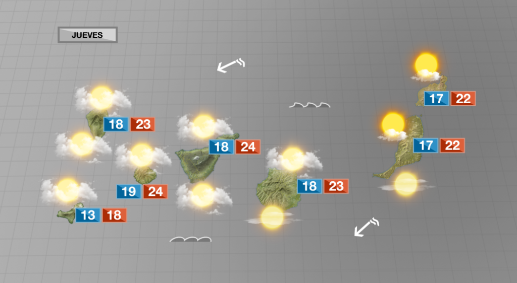 EL HIERRO: Viento alisio flojo – moderado. Nubes en cantidad variable, las importantes por la tarde en el norte y este de la isla. El viernes podría llover de forma débil.