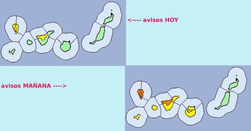 También hay avisos de nivel amarillo en La Palma por precipitaciones de 15 litros por m2 en una hora, que podría alcanzar los 60 litros por m2 en 12 horas, en la primera mitad de la jornada, con especial afección en los municipios del oeste de la isla. Pueden producirse tormentas de carácter ocasional.